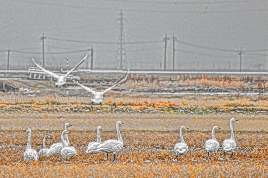 降りしきる雪と放水による水しぶきで、撮った写真はほぼモノクロ世界