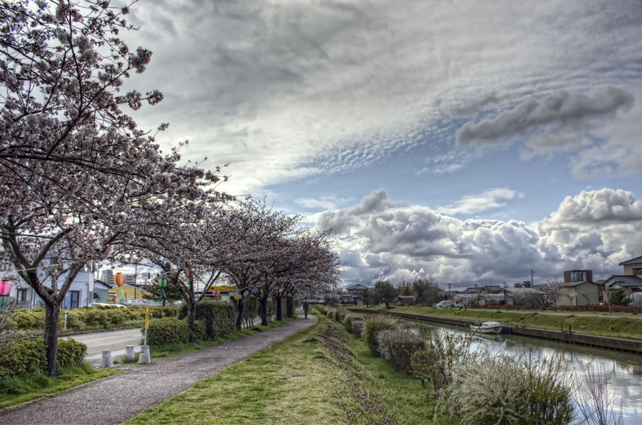 写真は、通勤途中にある西川沿いの桜並木、けどメインは複雑な雲のほう