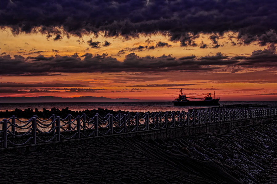完全に余計だったな。。。シンプルに、夕焼け、海、船で良かった