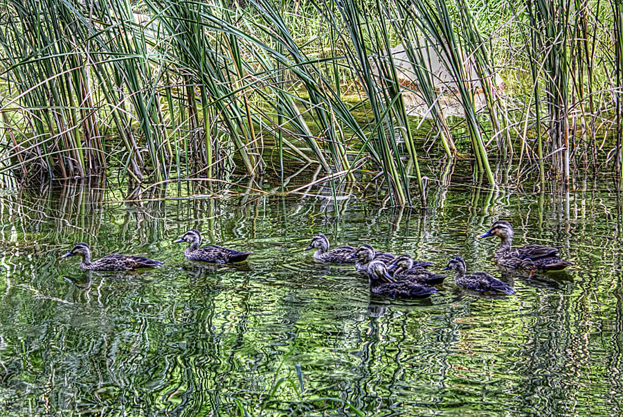 次々に親を追い越した小ガモは、泳いだり、ジャンプしたり