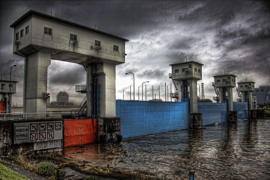 ちなみに、この背後にある水門には、船数隻、コンテナ何個かを含め