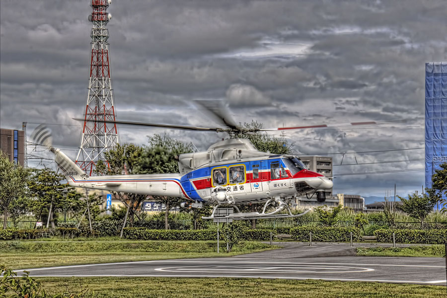 本川大橋のヘリポートに着陸していたので、しばらく撮影会となった
