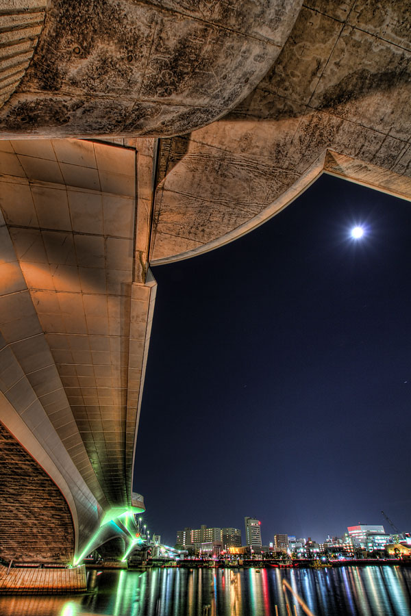 合成までの作業はどちらかと言うと機械的なデータ処理で、シーンの階調を上から下まで一様に並べる作業。HDRソフトは、露出補正値を輝度にかけ合わせて、複数の画像を重ねて平均を取る、というような処理をしていると思う。たぶん。これで出来るのが、画面に表示できない超広い階調幅を持った画像。真のHDRI。