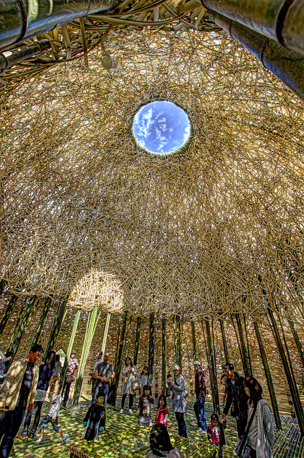 中から見ると、天井の穴から青空が覗き、宇宙に浮かぶ地球みたいです。そこから入り込んだ光が作る白い円はちょうど月に見えます。時間とともに地球をぐるぐる周るでしょうし、網目状に組まれた竹は宇宙の大規模構造を模している? というのは深読みしすぎか。。。 でも、この空間全体が宇宙を表現している、そう感じました。