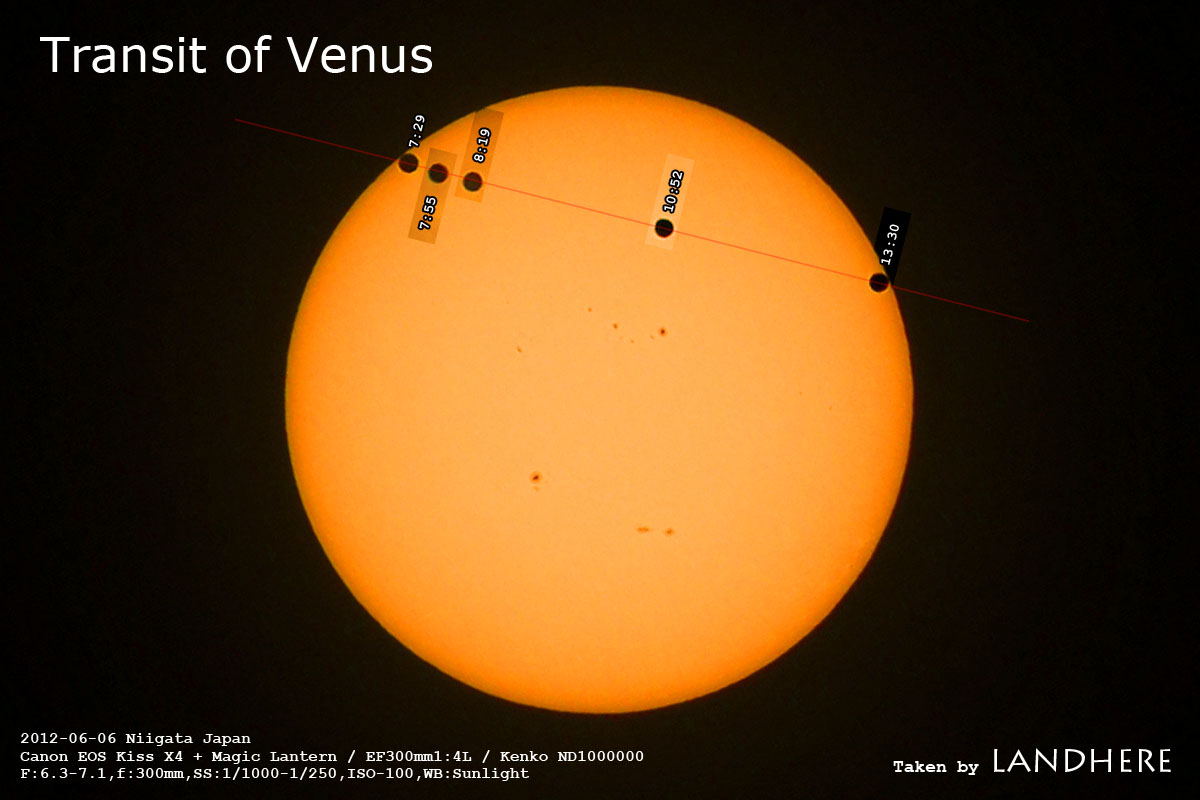 こうした画像処理を行った結果、金星の影が一直線上に並び、思わず感動してしまいました(^^)v この調子で金星の点線を描きたかった訳ですが、雲に邪魔された部分の傾きデータが得られず、5枚合成が限界でした(´・ω・`)