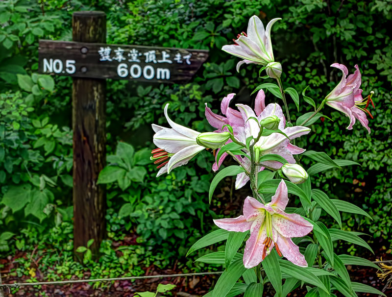 5合目付近にユリがあるのは分かってましたが、昨日はちょうど咲いていました。看板には「オトメユリを植えました」とありました。オトメユリ、ヒメサユリとどこが違うんだろう、とググってみると呼び方が違うだけで同じであるとのことです。なるほど、下田まで出張らなくても、ここで見れるんだね(^^♪