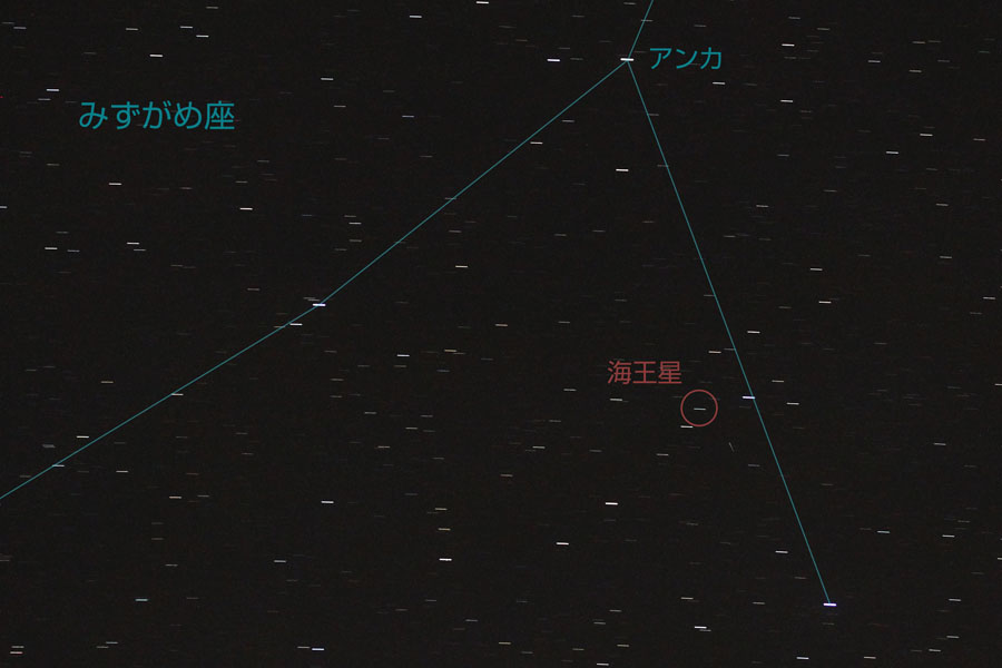 海王星に何かがニアミスしていました。動き方から地球の軌道上の物体だと思いますが、よく見る衛星にしては動きが遅すぎ(各コマのシャッタースピードは30秒)ないでしょうか。衛星や小惑星を調べてみましたが、残念ながら該当するものはありませんでした。何なのかすごく気なります。