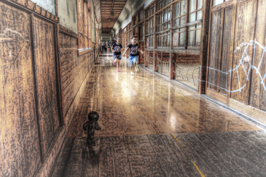 こことは違うけど、自分、小学校は木造校舎でした。こういう廊下の雑巾がけやワックス掛けをしたし、ピシャピシャ鳴る窓のガラスを新聞紙で磨きました。冬は、石油ストーブ用のバケツの氷で遊ぶのが楽しみだったし、後ろの席は隙間風で寒かった。それでも、温もりを感じる木造校舎、お疲れ様です。