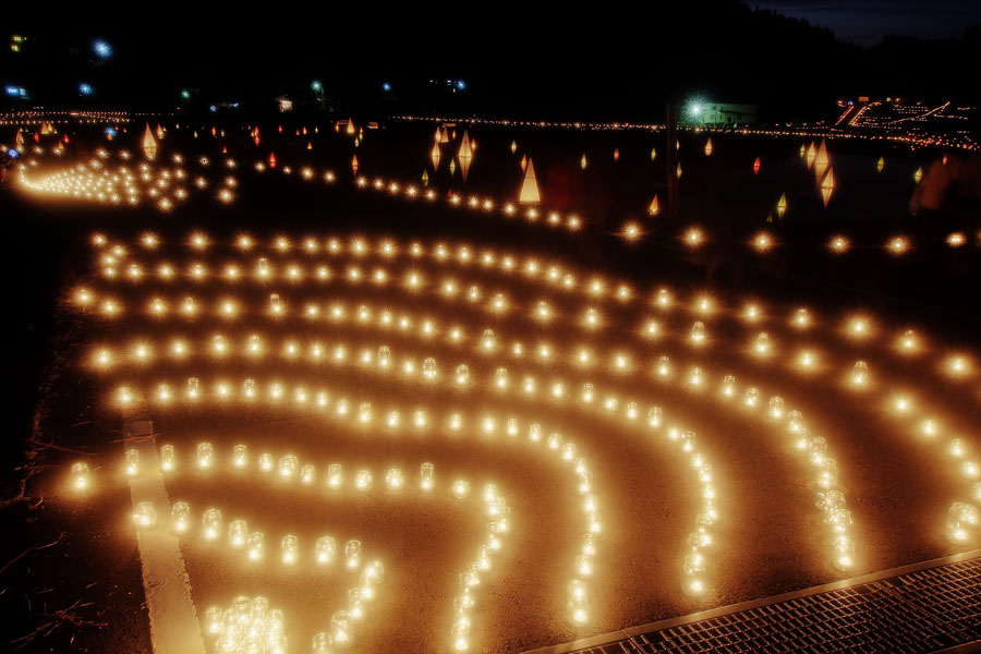 今年は田んぼに水張ってました。手前は道路にビンが並べられています。奥側は水を張った水田に三角のオブジェが浮かんでいます。道路の左側は側溝になっているのですが、ちょうどこれを撮影する直前に女性の方が転落してしまいました。ゴツっという鈍い音がして、「大丈夫ですか?」の問いに「大丈夫です」と答えていましたが、とても大丈夫そうには見えませんでした。漆黒の中、明かりはとても綺麗でしたが、運営側は安全対策には気を配って欲しいです。おかげで、この後の撮影は気が乗りませんでした(´・ω・`)