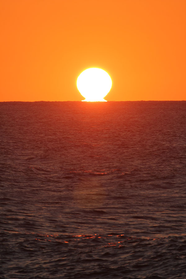 太陽ふたつ。雲ひとつない空に、遠くの船や鳥が歪む蜃気楼が見えて、だるまさんは確定でした。残念ながら、グリーンフラッシュは起こりませんでした。近頃の天気は読めないなぁ。