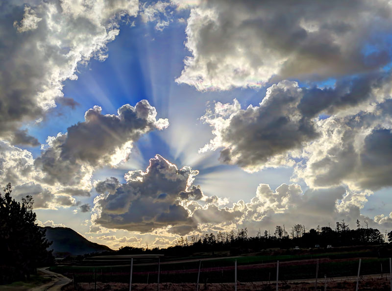 もし本当に現れるとしたら、こんな感じの薄明光線の中かも知れません。この写真のように、太陽がわりと高い位置にあり、雲で隠されている、チンダル現象が起きている、という条件です。これが運良く5本の指に分かれていたら本物の「神の手」となるでしょう。