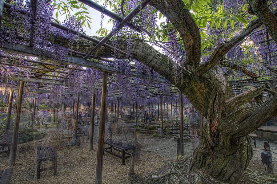 北方文化博物館の大藤です。微妙に満開前でした(昨日撮影)。無料開放は土曜日までやってますので、最後のほうに行った方が良さそうです。私はもう行けなさそうなので、昨日の素材を使用します。人が切れなさそうなため、2セット撮って加算平均コンポジットすることで、人の存在を薄めています。何気に発見した有効なHDR手法のような気がします。