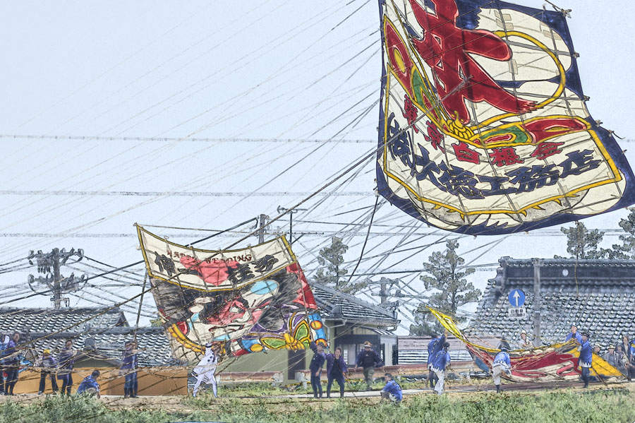 土曜日は白根の大凧合戦に行きましたが、素材的には全滅に近いので、水彩画風にしてごまかしました。実は、まともに見に行ったのは今回が初めてです。畳24畳分の大凧が揚がるだけでもスゴイ迫力ですが、中之口川を挟んで大凧同士を絡め合い、最後は綱引きで綱を引きちぎるという豪快なお祭りです。