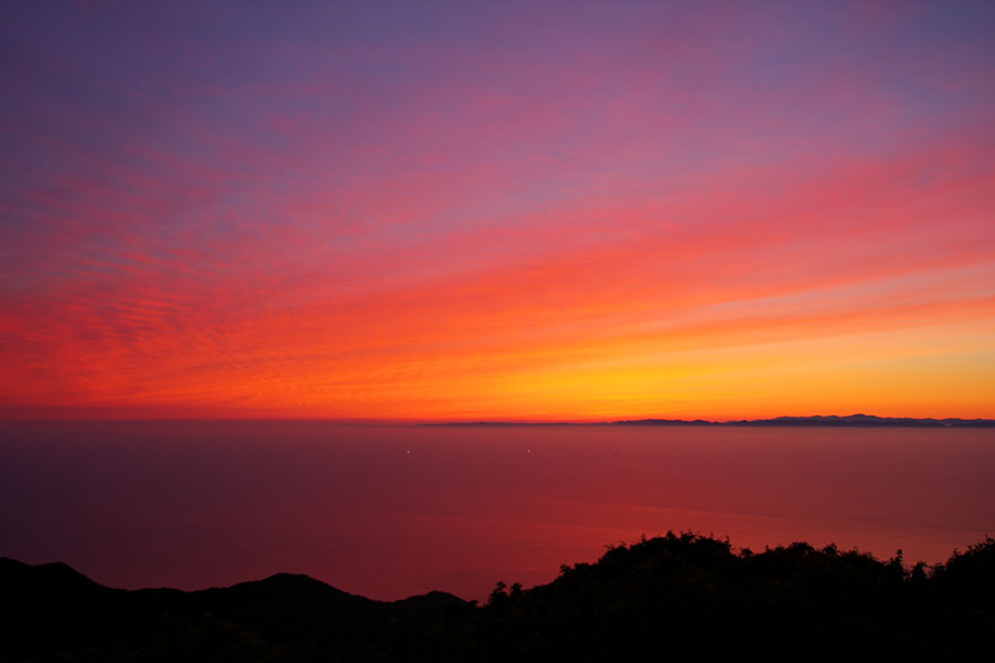 すばらしい夕陽の後の、すばらしい茜空をずっと眺めていました。カメラに収まらない広大な範囲が茜色に染まって、ベールのような海霧越しに、漁船の集魚灯が白い蛍のように優しく灯っていました。