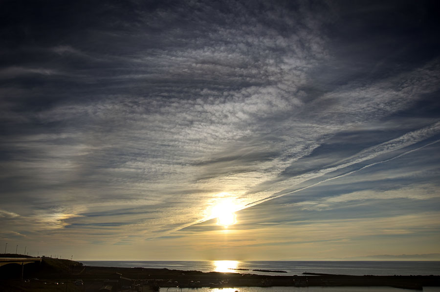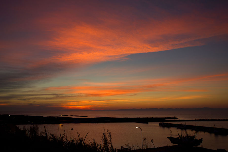 金曜日(4日)は新聞に載るほど焼けたそうですが、仕事の都合で撮り逃してしまいました。日が短くなってどんどん夕陽に間に合わなくなっていきます。この日(7日)は空や雲が良さそうだったので、早めに切り上げて新川漁港に行ってみました。すでに夕陽は佐渡を逸れ、水平線に沈んでいます。秋ですねー。