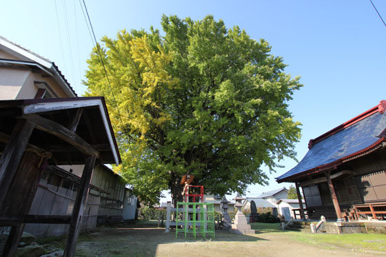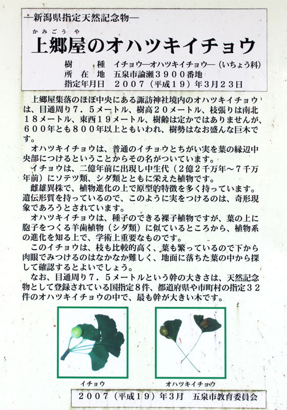 五泉市の上郷屋集落にある、オハツキイチョウを見に行ってきました。紅葉を期待したのですが、まだ早かったようです。このイチョウは、葉っぱに実をつける珍しい特徴があり「オハツキイチョウ」と呼ばれています。境内の草刈りをしていた地元の方に色々とお話を伺いました。