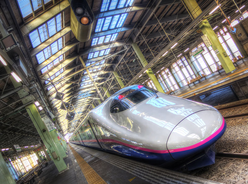 写真は、こないだ出張のときに乗ったE2系です。普段は水平を意識して写真を撮りますが、乗り物だけは積極的に崩したほうが、(止まっていても)動きが感じられる構図になる気がします。似たような構図のこの新幹線と比べてみてください。