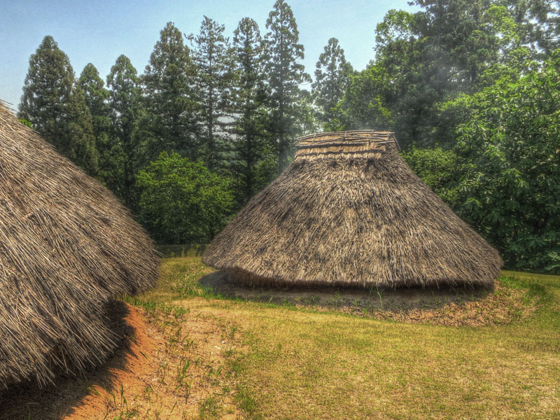 弥生時代の遺跡で、小高い丘の上にあります。弥彦山・角田山が一望でき、昔の人もこの同じ形の山並みを眺めていたはずです。いくつかの復元された竪穴住居があり、燻蒸(?)作業しているものは、煙が出ているので、生活感が感じられます。写してみたのですが、動いてないと分かりにくいです。