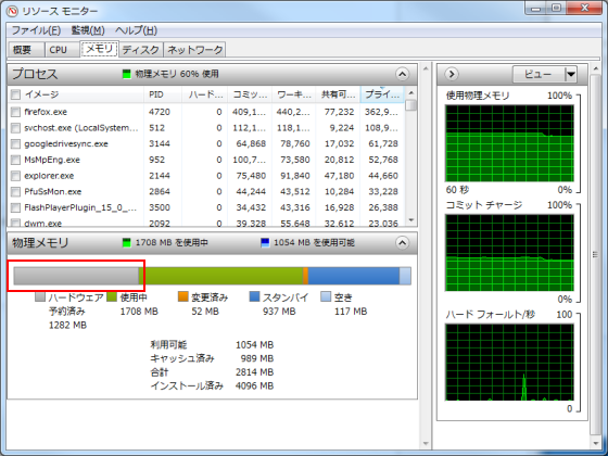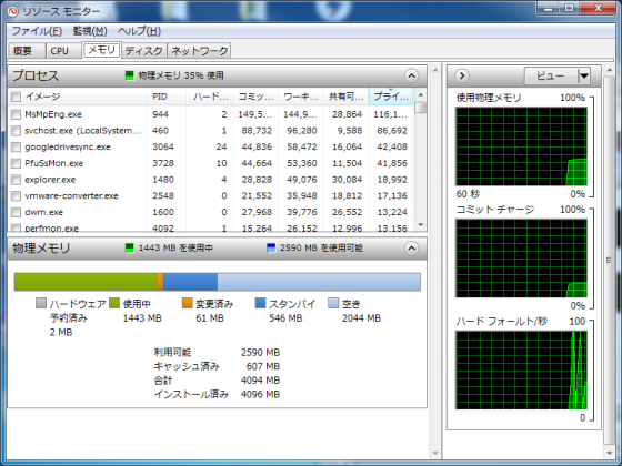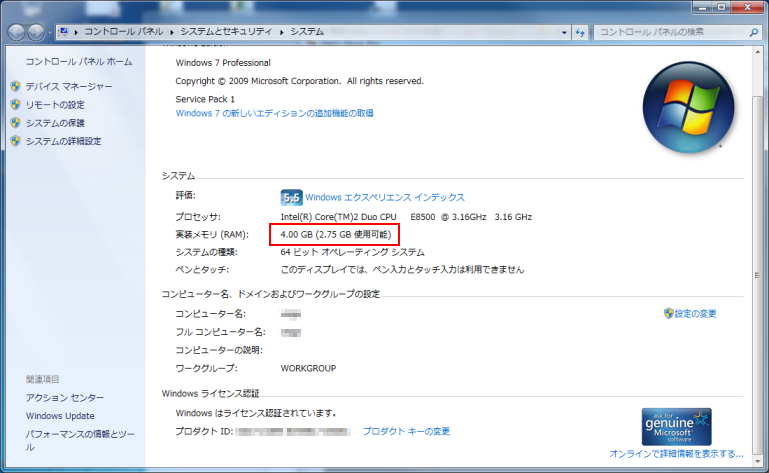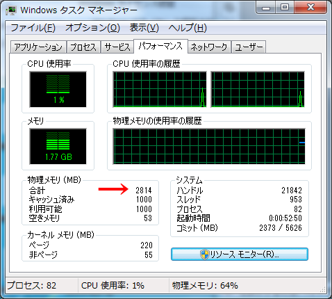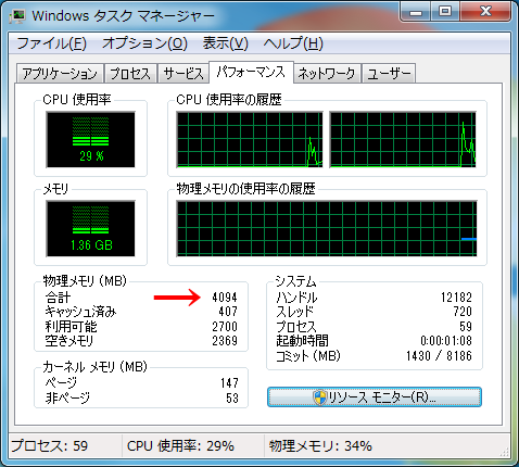 WIndows7 ですが、最近メモリが足りなくなることが頻発するようになっていました。 最近のブラウザはメモリを贅沢に使うようになっているし、作業上3種類を同時起動していましたから、仕方ないのかなと。 でも、さすがに我慢できなくなってきて、増設しようかと調査していたら、すでにマザーボードの最大容量4GBを積んでいて、これでメモリ足りないなんて訳ないだろうと疑い始めます。 システムのほうをチェックしていて、ようやく気づきました。 システムのプロパティでは4GBと表示されているのに、タスクマネージャでは2.8GBになっています。 しばらく見比べていて、システムのプロパティのある表示に目が止まります。 あれ? カッコ書きで2.75GB使用可能って書いてある。 なるほど、今まで2.75GBしか見えて無かったってことですよね。