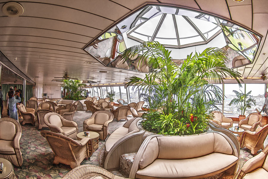船内とは思えないくらい広い空間を使ったラウンジです。大きな天井窓が4つあり(写真はその半分)、南国の観葉植物のグリーンを明るく照らしています。