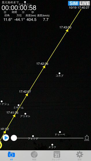 SpaceStationARというアプリを使うと、ISSが画面のどこを通過するのか見当をつけることができます。撮影もNightCapというアプリのISSモードを使えば、ARで合わせたままの画角で撮影できます。