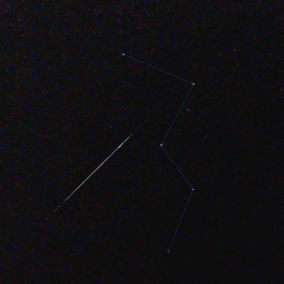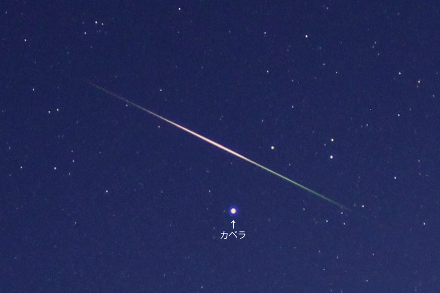 チャンスがあれば自宅でカメラ回しています。感度を思いっきり上げれば、なんとなく天の川が見えてくる程度の空です。写ったのは、長さと方向から、空の反対側(11月上旬に極大になるおうし座流星群の放射点)から来ているようです。