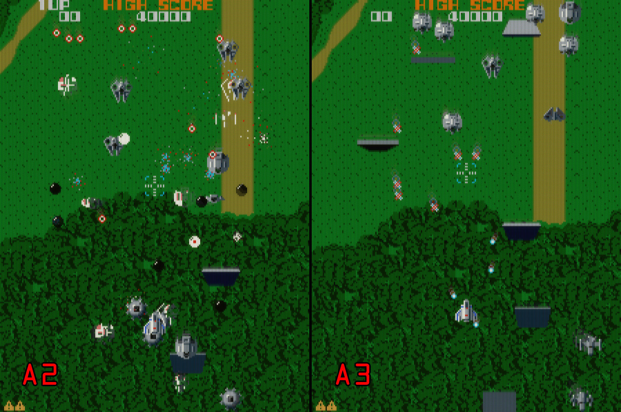 なぜバキュラの領域を使わなかったのか? という点が残りますが、これについてはエリア7に繋ぐためとも考えられます。もし領域を使ってしまうと、少なくとも1.5画面前くらいまでに攻撃を停止させ、領域をクリアにしておかねかればならないはずです。ゼビウスは制約が多くてエリア間もうまく調整しないと、前のエリアの影響を受けてしまうのです(エリア7は、6→7 と 16→7 両方とも調整が必要なのです)。つまり16面のラストに A3 の攻撃を展開しようとすると、必然的にバキュラの領域は使えない、ということになるのです。