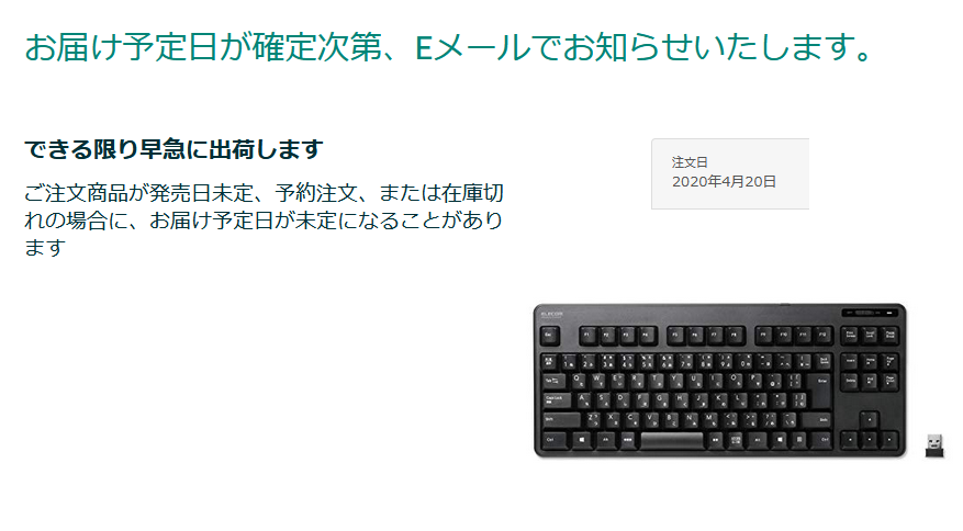 4/20 に注文して 5/31~6/2 に配送予定だそうだ。先日購入したキーボードが酷い製品だったので、実は早く欲しかったのですが、最長記録ですね。過去 Amazon でこんなに待たされたことがありませんね。