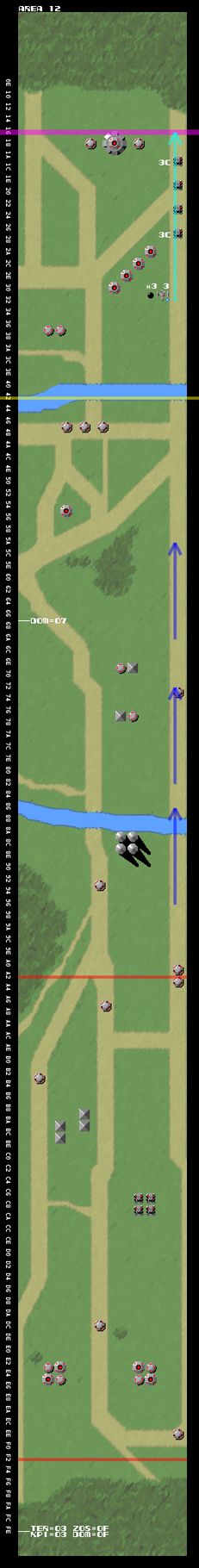 紫ゾーンワープスポット画面の上端がこの範囲に入っている瞬間にミスすると次のエリアをスキップする(爆発の瞬間に入っている必要がある)