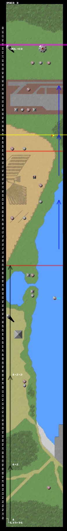 紫ゾーンワープスポット画面の上端がこの範囲に入っている瞬間にミスすると次のエリアをスキップする(爆発の瞬間に入っている必要がある)