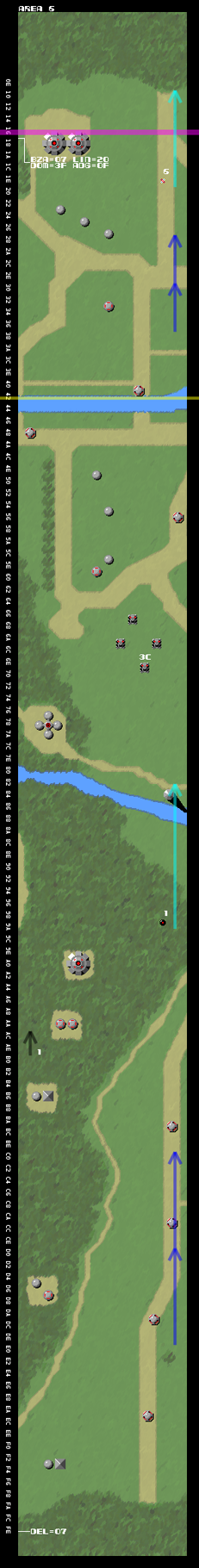 紫ゾーンワープスポット画面の上端がこの範囲に入っている瞬間にミスすると次のエリアをスキップする(爆発の瞬間に入っている必要がある)